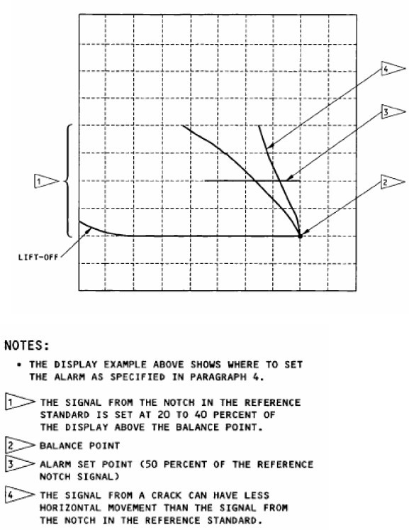 四儀器標定Instrument Calibration A. Set the frequency between 50 and 500 kHz. NOTE: To examine scribe lines, set the frequency between 50 and 150 kHz if possible. B. Calibrate the instrument with the applicable reference standard. Paragraph 5.E. identifies the different types of structural configurations that can be examined. The reference standards to use for the different structural configurations to be examined are: (1)Large Areas, Near an Edge, On an Edge, Radius: Use reference standard 126. NOTE: To examine an area where scribe lines have been removed, and before more material is removed for an insurance blend, it is permitted to use a reference standard with a notch depth as small as 0.008 inch (0.20 mm). It is not permitted to use a notch depth that is less than 0.008 inch (0.20 mm). Before you blend scribe lines, make sure it is permitted in the repair instructions. (2). Flush Head Fasteners: Use reference standard NDT1048. (3) Protruding Head Fasteners: Use reference standard 188A. C. Set the vertical to horizontal gain between 2:1 and 4:1. D. Set the filters as follows: (1). Set the high-pass filter to off or zero Hz. (2). If the instrument has a low-pass filter: (a) Set the low-pass filter to its highest value (b).Decrease the filter value to get a stable dot. E. Put a nonconductive shim on the reference standard. The thickness of the shim must be equivalent (| 0.003 inch (0.08 mm)) to the paint thickness on the airplane. F. Put the probe on the reference standard at least 0.5 inch (12.7 mm) away from the EDM notch and the edge of the reference standard. G. Balance the instrument. H. Adjust the balance point to 20 percent of the display as shown in Detail VIII. I. Adjust the instrument for lift-off. Adjust the phase control so that the lift-off signal moves horizontally to the left when the probe is lifted off of the part surface. J. Move the probe across the notch in the reference standard. K. Adjust the gain to get a signal that is 20 to 40 percent of the display above the balance point as shown in Detail VIII. L. If the instrument has an alarm, set the alarm as shown in Detail VIII. M. Move the probe across the notch in the reference standard to find the maximum scan speed. The scan speed is too fast if the signal is less than 90 percent of the calibration notch signal. NOTE: Higher scan speeds are possible with a higher low-pass filter value. ![]()
