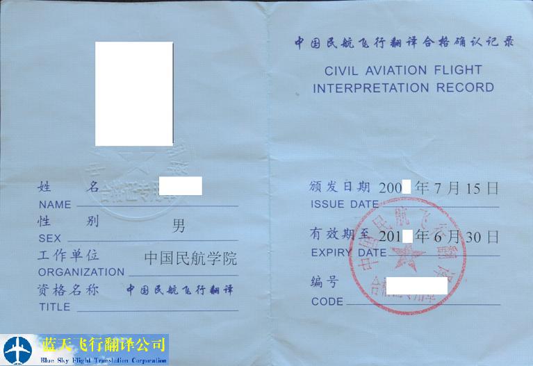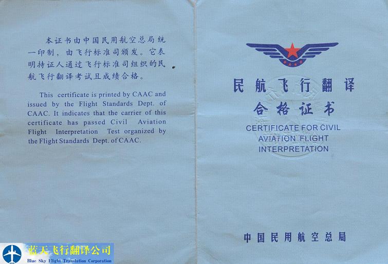民航飛行翻譯合格證書(Certificate for civil aviation flight interpretation)(簡(jiǎn)稱飛翻證)由中國(guó)民用航空總局統(tǒng)一印制,由飛行標(biāo)準(zhǔn)司頒發(fā)。它表明持證人通過飛行標(biāo)準(zhǔn)司組織的民航飛行翻譯考試且成績(jī)合格。 This certificate is printed by CAAC and issued by the Flight Standards Dept. of CAAC. It indicates that the carrier of this certificate has passed Civil Aviation Flight Interpretation Test organized by the Flight Standards Dept. of CAAC. 民航飛行翻譯合格證書 Certificate for civil aviation flight interpretation 中國(guó)民用航空總局 民航飛行翻譯合格證書1 Certificate for civil aviation flight interpretation 2 |