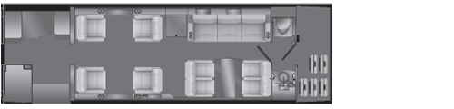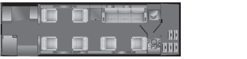 ![]() Executive Floor Plan 2 Executive Floor Plan 3 This alternative 10-passenger configuration, with club seating in the forward compartment, offers a 4-seat divan and 2 facing club seats in the aft compartment. An extended lavatory compartment also doubles as a full-size changing room. |