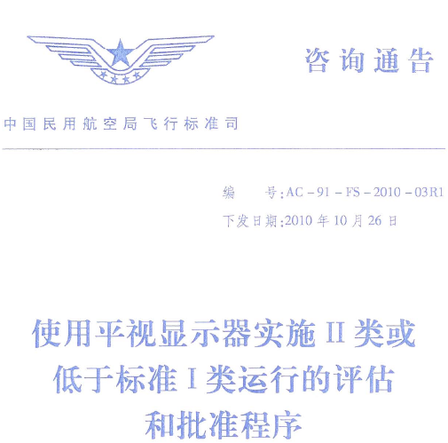藍(lán)天飛行翻譯公司承接中國民用航空局飛行標(biāo)準(zhǔn)司的使用平視顯示器實施II類或低于標(biāo)準(zhǔn)I類運(yùn)行的評估和批準(zhǔn)程序咨詢通告翻譯任務(wù),編號AC-91-FS-2010-03R1 Advisory Circular Translation