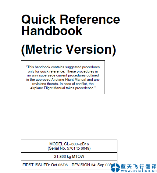 北京藍天飛行翻譯公司完成公務機公司的第34版龐巴迪挑戰(zhàn)者605全套飛行手冊翻譯任務 REVISION 34: Sep 03/15 Bombardier Challenger 605 Flight Manual Translation 第34版龐巴迪挑戰(zhàn)者605飛機飛行手冊 Bombardier Challenger 605 Airplane Flight Manual