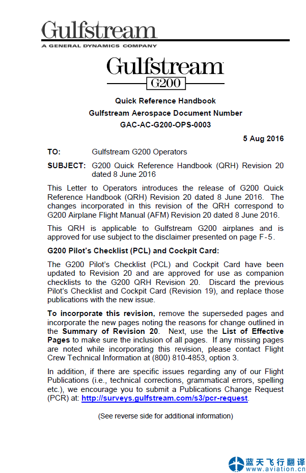 藍天飛行翻譯公司完成公務(wù)機公司的灣流G200飛機飛行手冊和快速檢查單翻譯任務(wù) GULFSTREAM 200 AIRPLANE FLIGHT MANUAL and Quick Reference Handbook Translation ![]() 灣流G200飛機飛行手冊 GULFSTREAM 200 AIRPLANE FLIGHT MANUAL ![]() 灣流G200快速檢查單 GULFSTREAM 200 Quick Reference Handbook 灣流G200飛機飛行手冊(GULFSTREAM 200 AIRPLANE FLIGHT MANUAL)的主要內(nèi)容包含有: G200 AFM Introduction Copyright & License INTRODUCTION GENERAL REVISIONS SUPPLEMENTS DEFINITIONS LIMITATIONS EMERGENCY PROCEDURES ABNORMAL PROCEDURES NORMAL PROCEDURES SUPPLEMENTS COMPATIBILITY LOG OF MODIFICATIONS LOG OF REVISIONS LOG OF TEMPORARY REVISIONS LOG OF EFFECTIVE PAGES Limitations LIST OF FIGURES CERTIFICATE LIMITATIONS KINDS OF OPERATIONS REDUCED VERTICAL SEPARATION MINIMUMS (RVSM) MINIMUM FLIGHT CREW WEIGHT LIMITATIONS MAXIMUM CERTIFICATED WEIGHTS (LB/KG) MINIMUM FLIGHT WEIGHT (LB/KG) BAGGAGE COMPARTMENT WEIGHT AND LOADING CENTER-OF-GRAVITY LIMITATIONS Center-of-Gravity Envelope POWERPLANT LIMITATIONS APPROVED OILS APPROVED FUELS FUEL SYSTEM LIMITATIONS FUEL TANKS CAPACITY FUEL TANK TEMPERATURE LIMITATIONS (indicated) FUEL UNBALANCE MINIMUM FUEL FOR GO-AROUND Maximum Fuel Tank Temperature Vs. Altitude ENGINE OPERATING LIMITATIONS MAXIMUM RPM, N1 AND N2 MAXIMUM INTERSTAGE TURBINE TEMPERATURE TIME LIMITS OIL PRESSURE (At Normal Operating Temperature) OIL TEMPERATURE AMBIENT TEMPERATURE AND ALTITUDE ENVELOPE APU LIMITATIONS APU Load Limits without Mod 10163 SPEED LIMITATIONS MAXIMUM OPERATION LIMIT SPEED (VMO/MMO) MANEUVERING SPEED (VA) Speed Limitations MAXIMUM SLATS/KRUEGER/FLAPS EXTENSION (VSE/VFE) MAXIMUM LANDING GEAR EXTENSION (VLO/VLE) MAXIMUM LANDING GEAR EXTENDED ALTITUDE MAXIMUM TIRE GROUND SPEED MINIMUM CONTROL SPEED - AIR (VMCA) MINIMUM CONTROL SPEED - GROUND (VMCG) MAXIMUM AIR BRAKES OPERATION/ EXTENDED SPEED MINIMUM FLIGHT SPEED MAXIMUM WINDSHIELD WIPER OPERATING SPEED (PRE-MOD 10141) PROHIBITED MANEUVERS LOAD FACTOR LIMITS MAXIMUM APPROVED OPERATING ALTITUDE OPERATING TEMPERATURE/ALTITUDE LIMITATIONS OPERATING TEMPERATURE/ALTITUDE LIMITATIONS RUNWAY SLOPE LIMITATIONS (TAKE-OFF ONLY) MAXIMUM TAILWIND COMPONENTS APPROVED RUNWAY SURFACE TYPE HYDRAULIC SYSTEM LIMITATIONS APPROVED HYDRAULIC FLUIDS HYDRAULIC PRESSURE LIMITATIONS HYDRAULIC TEMPERATURE LIMITATIONS THRUST REVERSERS CABIN PRESSURIZATION MAXIMUM CABIN DIFFERENTIAL PRESSURE ANTI-ICE SYSTEM LIMITATIONS GROUND OPERATIONS DE-ICE SYSTEM LIMITATIONS ELECTRICAL SYSTEM LIMITATIONS DC STARTER - GENERATOR LIMITS BATTERY LIMITS HORIZONTAL STABILIZER TRIM OPERATING LIMITATIONS AUTOPILOT LIMITATIONS Yaw Damper ENHANCED SURVEILLANCE FLIGHT IDENTIFICATION (WITH MOD 10154) INSTRUMENT MARKINGS PLACARDS (Pre MOD 03842) PLACARDS (Post MOD 03842) Emergency Procedures LIST OF FIGURES EICAS WARNING MESSAGES EICAS Display - Primary Page GENERAL GUIDANCE Warning Messages ENGINE FIRE OR ENGINE OVER HEAT |
