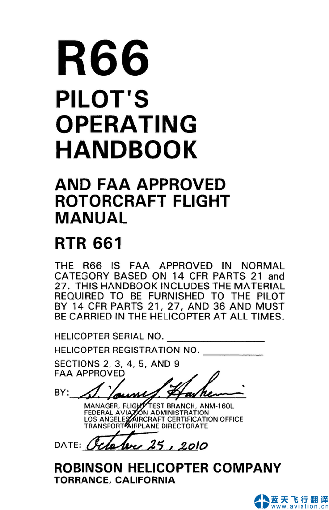 藍天飛行翻譯公司完成大型通用航空公司的羅賓遜R66飛行員操作手冊翻譯任務(wù) ROBINSON R66 Pilot's Operating Handbook Translation