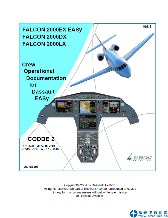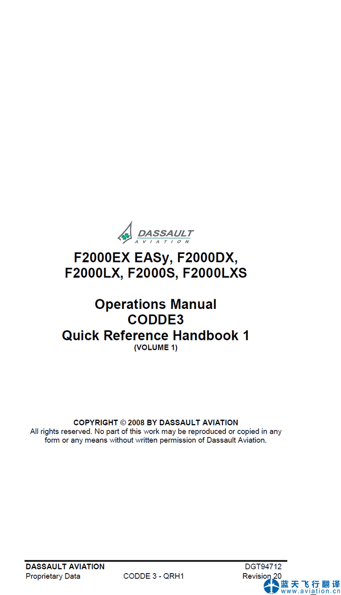北京藍天飛行翻譯公司完成2016年4月15日版本達索獵鷹FALCON 2000飛行手冊翻譯 FALCON 2000 Flight Manual Translation CODDE(Crew Operational Documentation for Dassault EASy) REVISION 18 : April 15, 2016,機組使用手冊為第18版,2016年4月15日版本 QRH(Quick Reference Handbook) Revision 20 快速檢查單為第20版 AFM(Airplane Flight Manual) REVISION 20 : April 15, 2016 飛機飛行手冊為第20版,2016年4月15日版本 ![]() FALCON 2000 CODDE(Crew Operational Documentation for Dassault EASy) 達索獵鷹2000機組使用手冊 ![]() FALCON 2000 AFM(Airplane Flight Manual) 達索獵鷹2000飛機飛行手冊