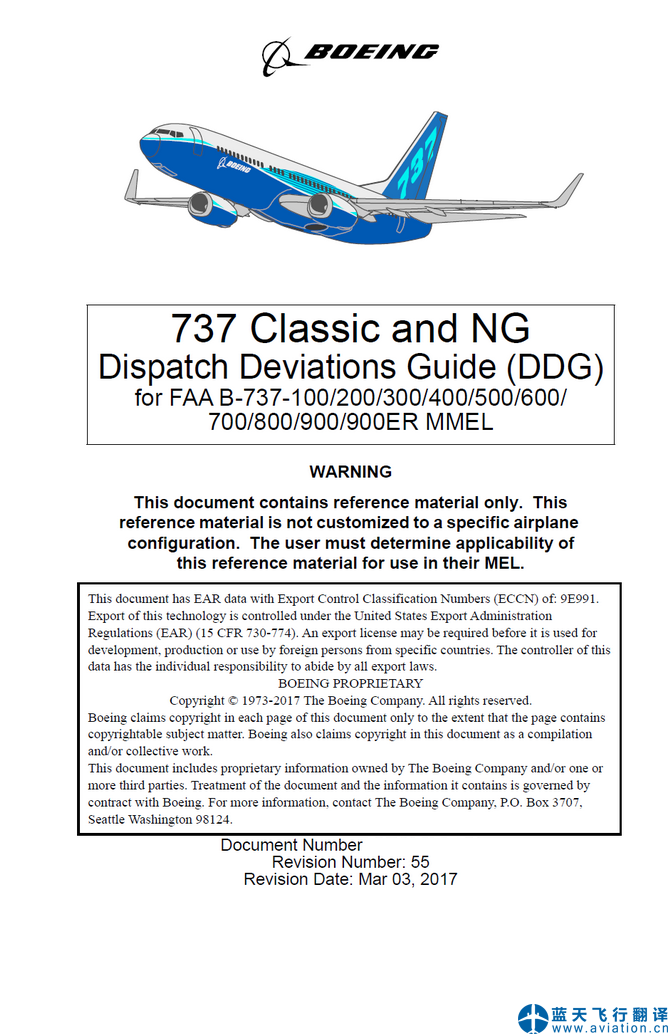 北京藍天飛行翻譯公司完成航空公司波音737放行偏離指南DDG翻譯任務 Boeing 737 Classic and NG Dispatch Deviations Guide (DDG) Translation