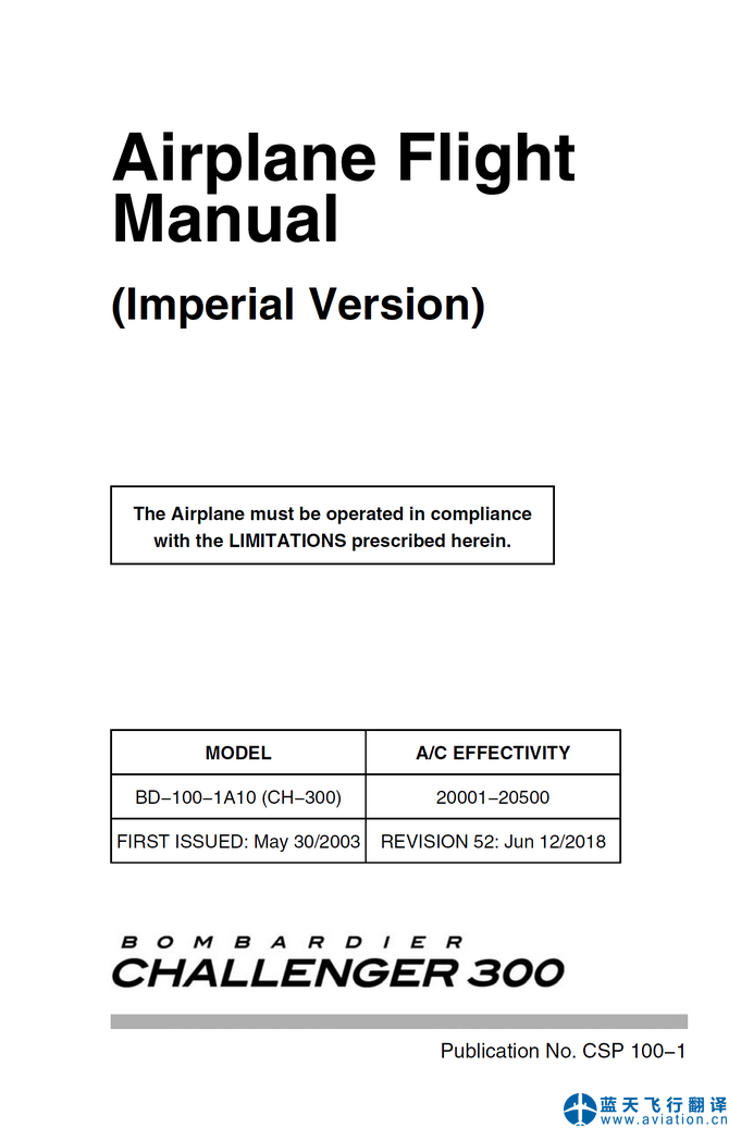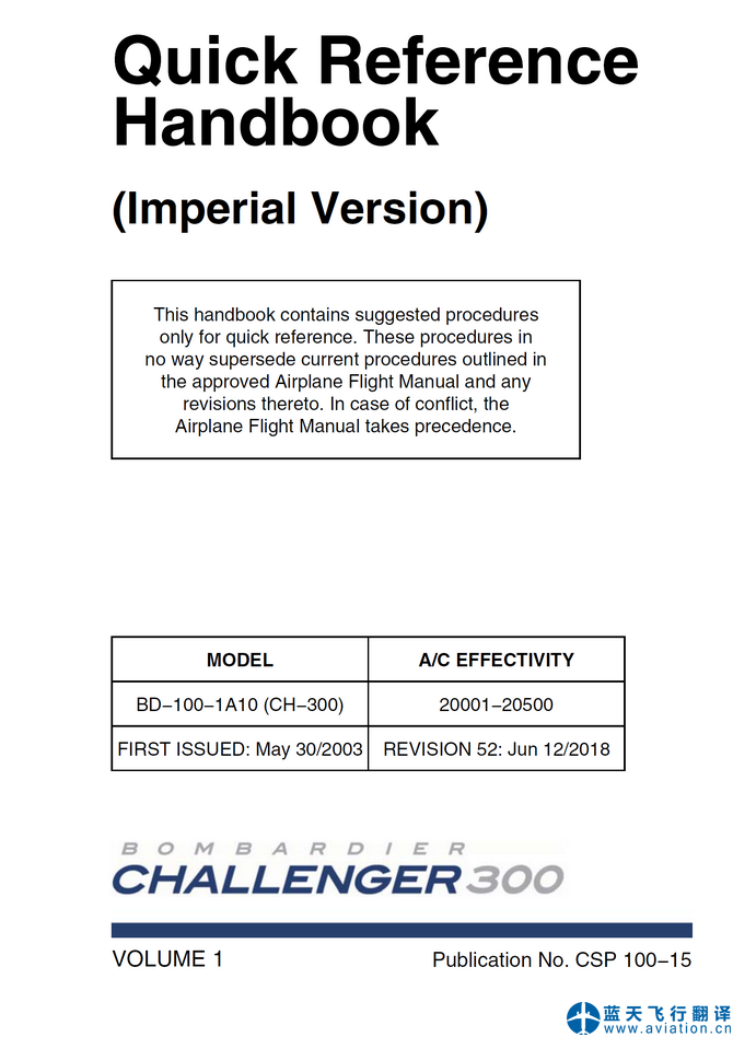 北京藍(lán)天飛行翻譯公司承接公務(wù)機(jī)公司2018年6月12日第52版龐巴迪挑戰(zhàn)者300公務(wù)機(jī)全套飛行手冊翻譯任務(wù) REVISION 52: Jun 12/2018 Bombardier Challenger 300 Flight Crew Operating Manual, Airplane Flight Manual and Quick Reference Handbook Translation