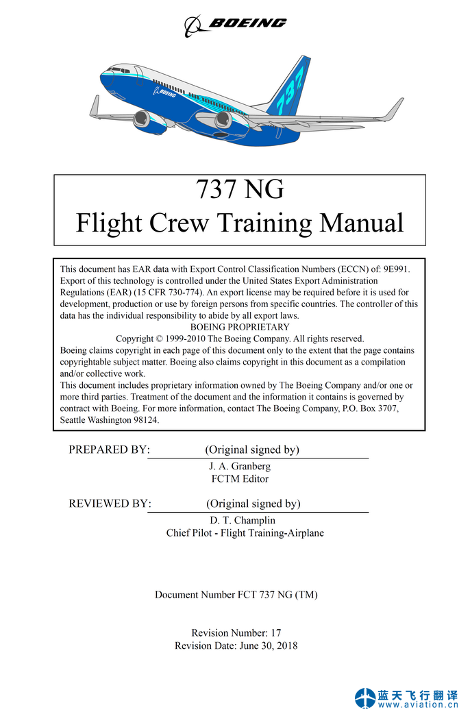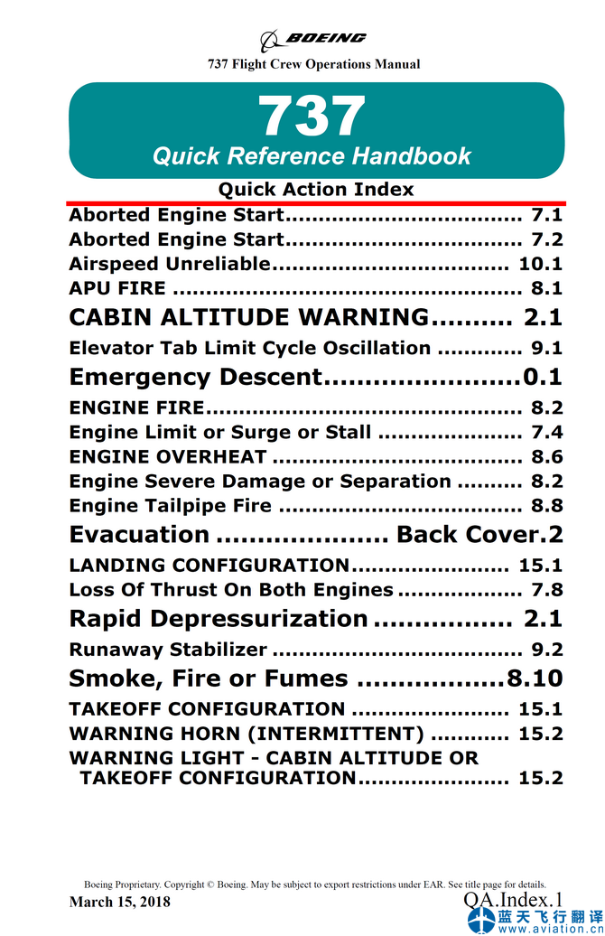 北京藍(lán)天飛行翻譯公司承接航空公司全套波音737-800飛行手冊翻譯任務(wù) 737-800 Flight Manuals Translation 此次翻譯的全套波音737-800飛行手冊包含有2018年3月15日(March 15, 2018)版本的737-800飛行機(jī)組使用手冊(Flight Crew Operations Manual),737-800快速檢查單(Quick Reference Handbook),737-800飛機(jī)飛行手冊(Airplane Flight Manual)和737 NG飛行機(jī)組訓(xùn)練手冊(Flight Crew Training Manual)。 ![]() ![]() 737 NG飛行機(jī)組訓(xùn)練手冊 737 NGFlight Crew Training Manual ![]() 737-800快速檢查單 737-800 Quick Reference Handbook ![]() 737-800飛機(jī)飛行手冊 737-800 Airplane Flight Manual |