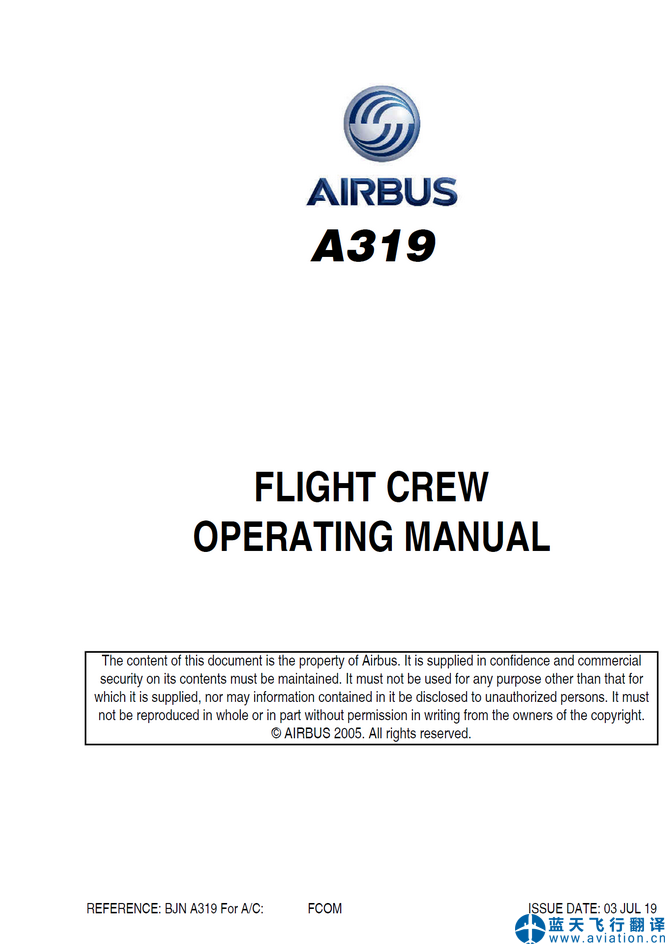 北京藍(lán)天飛行翻譯公司承接大型公務(wù)機(jī)公司的2019年7月3日版本空客公務(wù)機(jī)ACJ319飛行機(jī)組操作手冊(cè)(FCOM FLIGHT CREW OPERATING MANUAL)、ACJ319快速檢查單(QRH QUICK REFERENCE HANDBOOK)和ACJ319飛機(jī)飛行手冊(cè)(AIRPLANE FLIGHT MANUAL)翻譯任務(wù) 03 JUL 19 ACJ319 FLIGHT CREW OPERATING MANUAL, QRH QUICK REFERENCE HANDBOOK and AIRPLANE FLIGHT MANUAL Translation