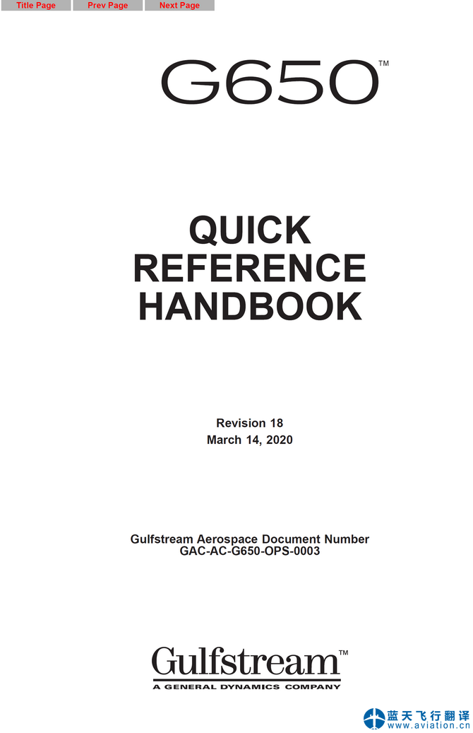 北京藍天飛行翻譯公司本次翻譯的灣流G650快速檢查單(QUICK REFERENCE HANDBOOK)版本為18版,修訂日期為2020年3月14日。