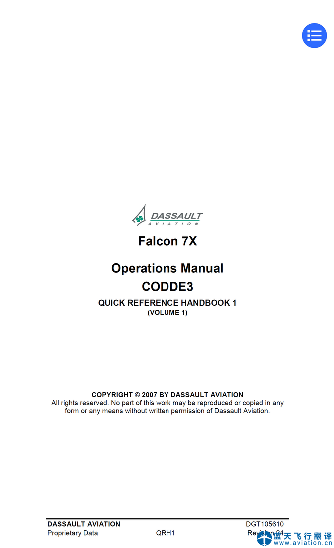 北京藍(lán)天飛行翻譯公司完成大型公務(wù)機(jī)公司的達(dá)索獵鷹7X快速檢查單翻譯任務(wù) DASSAULT AVIATION Falcon 7X QUICK REFERENCE HANDBOOK Translation