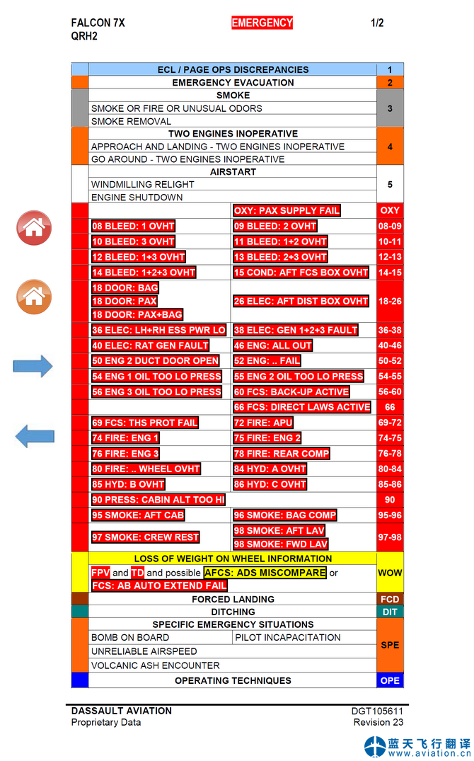 達(dá)索獵鷹7X公務(wù)機(jī)快速檢查單分為兩冊(cè),第一冊(cè)為限制、正常程序、特殊程序、性能、飛行計(jì)劃等,第二冊(cè)為應(yīng)急程序和非正常程序,本次北京藍(lán)天飛行翻譯公司翻譯的達(dá)索獵鷹7X快速檢查單第一冊(cè)為第24版,版本日期為2020年1月10日,第二冊(cè)為第23版,版本日期為2020年1月10日。