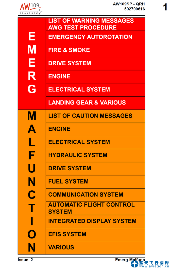 北京藍天飛行翻譯公司承接大型直升機公司的AW109直升機快速檢查單翻譯任務 AW109 Quick Reference Handbook(QRH) Translation