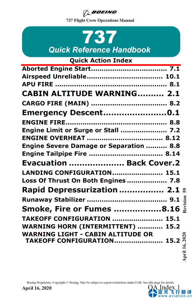 北京藍(lán)天飛行翻譯公司本次翻譯的737-800飛行機(jī)組使用手冊(cè)、快速檢查單和飛機(jī)飛行手冊(cè)修訂日期為2020年4月16日,總共包含62架飛機(jī)。